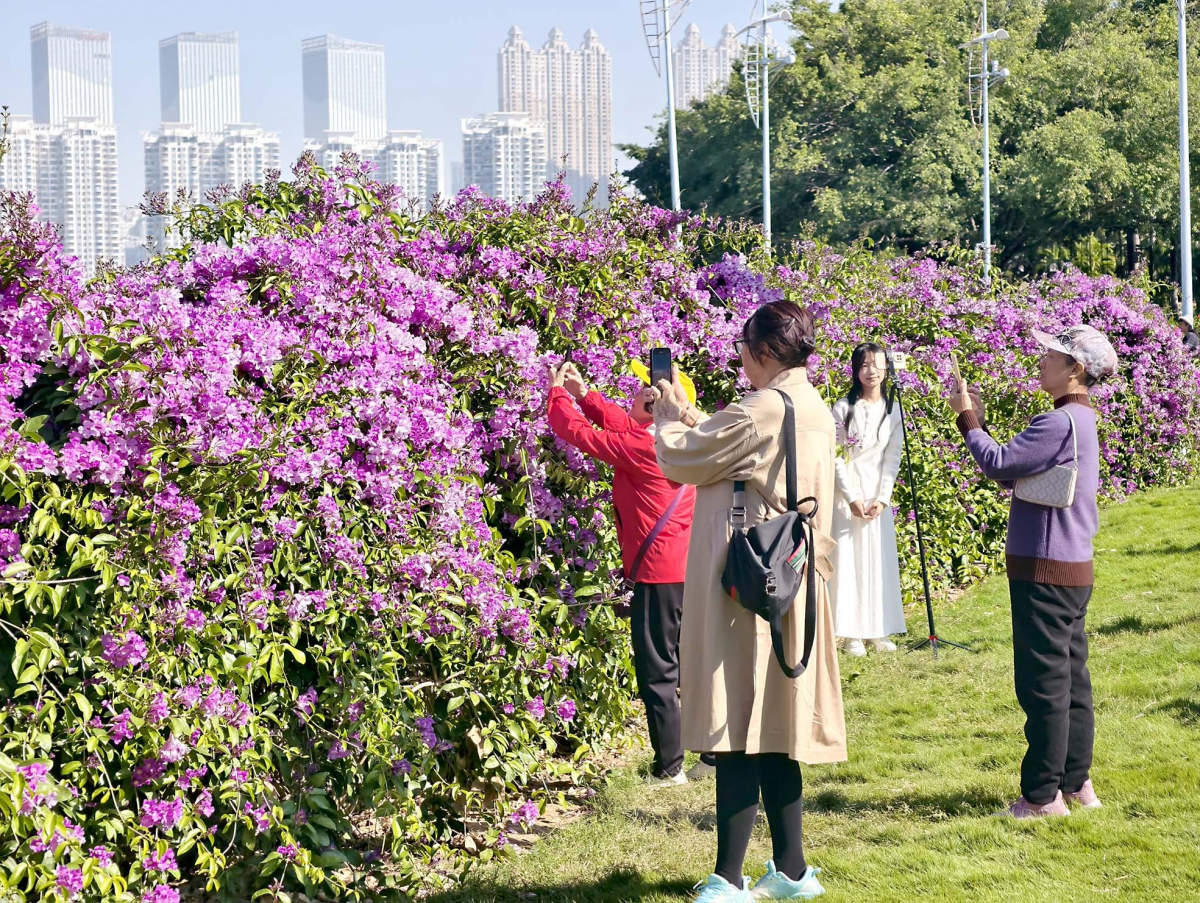 市民在南湖公园蒜香藤“花瀑”前赏花留影。记者 宋延康 摄
