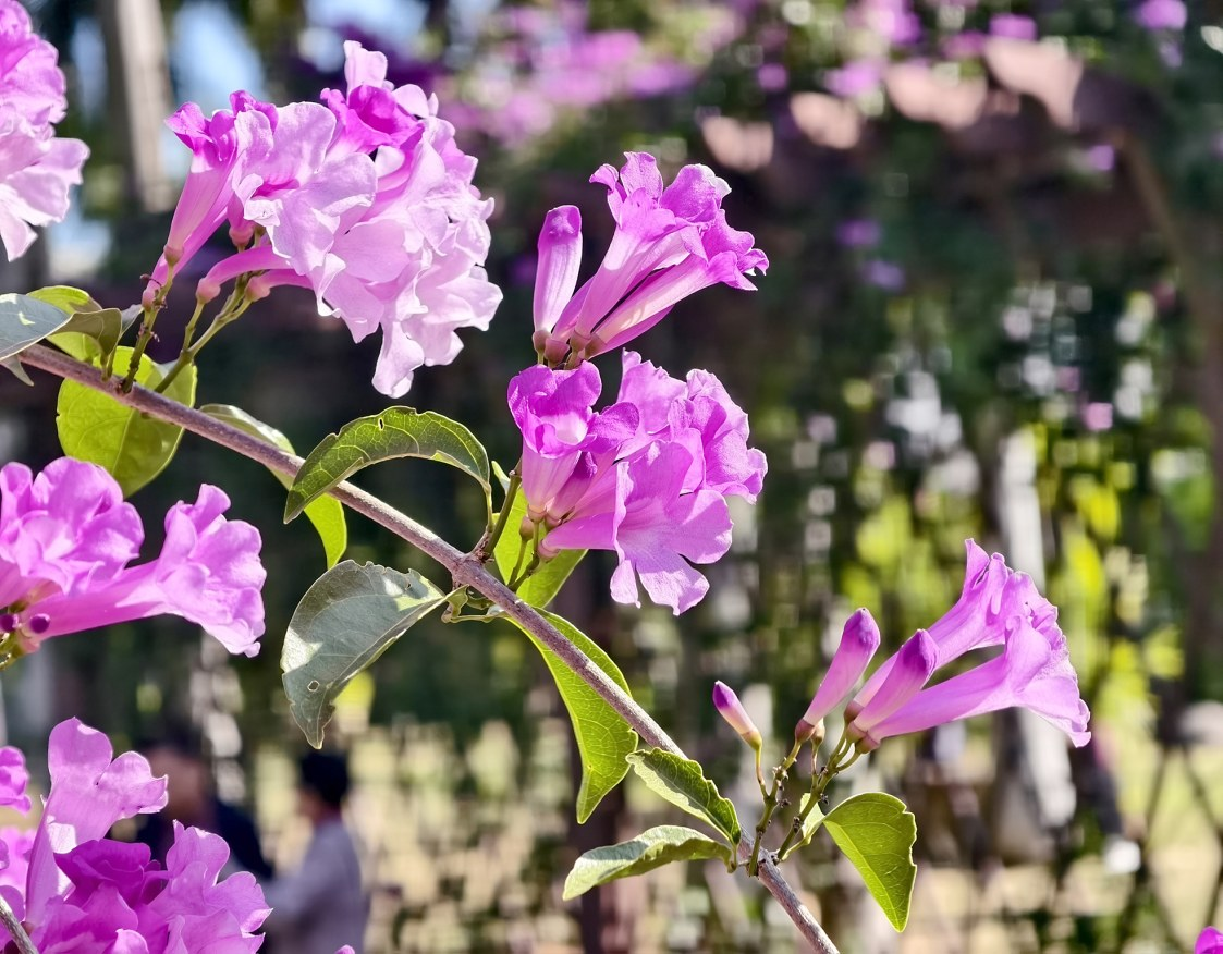“南宁蓝”连日在线,在暖阳陪伴下,各种秋冬花卉恣意绽放。南宁市南湖公园滨湖喷泉广场旁和大树盆景园的蒜香藤又迎来一年中最美的时节,盛开的花朵分外妖娆,吸引了众多市民前来赏花。蒜香藤属于紫葳科常绿藤状灌木,因其花叶揉搓之后有大蒜的味道而得名。蒜香藤有超强的爆花能力,而最让人着迷的,是它那身会随时间变色的“花裙子”。清晨刚绽放时,花瓣是淡雅的粉紫色,到了午后就变成温柔的浅紫色,再过一两天,又转为纯净的白色。因此,一大片盛开的蒜香藤“瀑布”,会有粉、紫、白三色花在藤蔓间交错,唯美又浪漫。