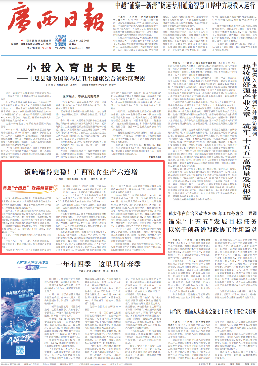 至此,广西粮食播种面积与总产量连续6年双增长。
