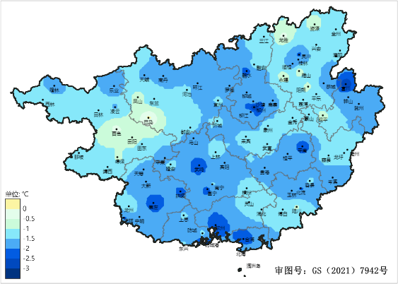 10月21日-11月10日广西平均气温距平分布