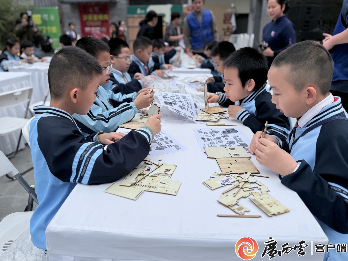 除了购好物,在这个年货集市,还有一场特别的互动——广西乡村工匠技艺传习活动,20组亲子家庭在这里开启沉浸式的非遗体验课堂。绣球制作区内,技艺娴熟的绣娘们现场传授针法并讲解图案寓意,亲子协作下,一个个精美绣球逐渐成型。古建筑模型制作区则成为“活态课堂”,工匠师傅们解析榫卯结构原理,指导学生和家长拼装模型,让非遗技艺的智慧与美感在亲手实践中得以领会。
