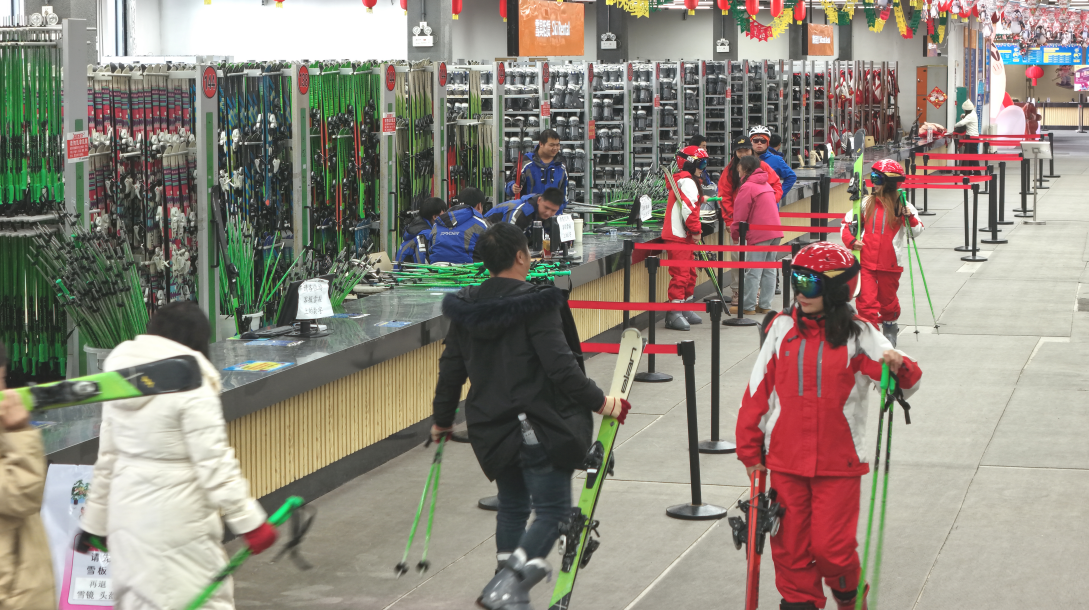 滑雪爱好者在游客服务中心租赁滑雪用具(央广网发 王战飞 摄)
