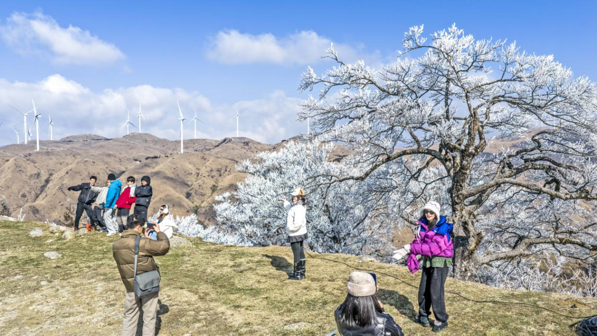 高山上形成了雾凇景观,游客纷纷前往打卡拍照(央广网发 王战飞 摄)