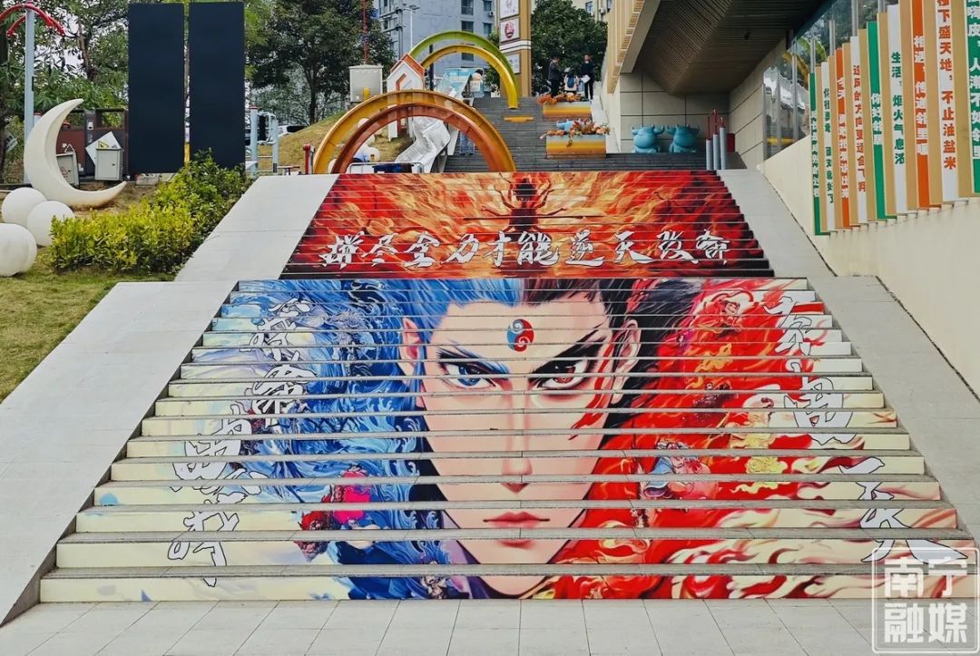 从银幕到街头哪吒墙绘成打卡新地标“哪吒和敖丙的彩绘墙在这里,赶紧帮我拍个照。”3月10日,在邕州古城·三街两巷,记者看到一幅哪吒与敖丙的彩色墙绘格外生动醒目,不少市民在此排队拍照。专门带5岁儿子来打卡的钟女士表示:“孩子‘二刷’电影后对哪吒非常着迷,从网上知道这个彩绘墙,就特地带他来打卡。”她认为,彩绘墙能更直观地展示传统文化的魅力,让这些经典故事以更年轻化的方式传播。在南宁邕州古城·三街两巷,市民与哪吒、敖丙彩绘墙合影。记者宋延康摄记者从邕州古城·三街两巷相关工作人员处了解到,该墙绘由电影爱好者在3月初合力完成,长约3.5米,高约2.6米,希望给电影的粉丝提供一个与“偶像”合照的打卡点。为了保护历史文化街区墙体,该墙绘是在可拆卸的木板上创作的,色彩鲜艳、形象生动,彩绘师将哪吒俏皮的表情和敖丙“少年老成”的姿态表现得活灵活现。至于后期是否还会增添更多人物形象,该工作人员表示会根据市民的反馈做动态的调整。位于建政路的哪吒彩绘墙形象鲜活,深受市民喜爱。记者宋延康摄在建政路实验电影院停车场入口,一幅“魔童灵珠合体”的墙绘,也引来不少市民打卡。画面右半边是红色的哪吒,左半边是蓝色的敖丙,红蓝两色交织,形成强烈的视觉冲击。正在驻足拍照的市民李女士告诉记者,前两天她路过这里时,看到彩绘师正在描画哪吒,没想到那么快就完成创作,细节活灵活现,非常震撼。兴宁盛天地阶梯哪吒彩绘富有故事性。记者宋延康摄在兴宁盛天地的一处阶梯,哪吒彩绘则更具有互动性——哪吒身披红色火焰傲立台阶,还融入了“我命由我不由天”“拼尽全力才能逆天改命”的经典台词,让人仿佛听到昂扬的BGM在耳边响起。记者看到,市民陈女士在楼梯上走来走去,寻找适合的打卡角度。“这里完全还原了电影的热血感!”陈女士还向记者展示了她收藏的哪吒卡片。[详细]