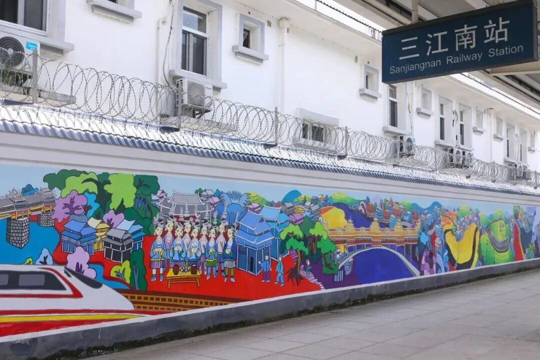 三江南站,如今已成为展示三江茶文化的“第一会客厅”。站前广场上,一片小小的茶园静静铺展,旅客拖着行李箱路过,总要停下脚步,俯身细看那嫩绿的芽尖,用手机拍下这“第一眼的茶乡”;候车大厅里,便利店的货架上摆满了三江早春茶,包装简约而精致,不时有旅客拿起一盒端详,扫码付款后便塞进行囊——茶香就这样随着高铁飘向远方;站台上,侗族农民画家绘制了一幅长达100米、高2米的文化墙,墙面上侗家女在茶园中采春茶的景象栩栩如生,列车进站时,匆匆赶车的旅客也不禁放慢脚步,多看一眼茶乡风光。